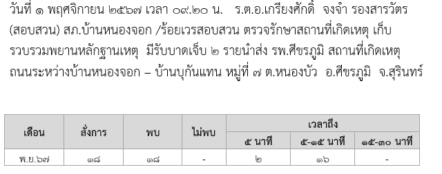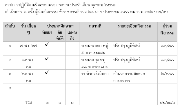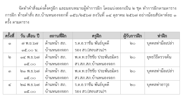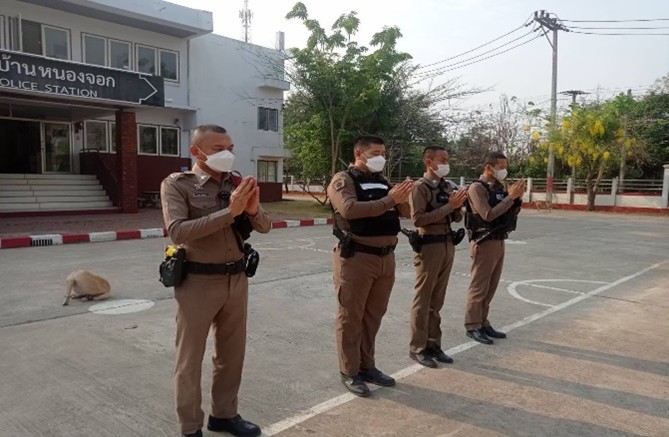 วันที่ 1-31 พฤศจิกายน 2567 เวลา 08.00 น. พ.ต.ท.ธวัชชัย ประพันธมิตร สว.สภ.บ้านหนองจอก และ ด.ต.สันติ พลเหลา ผบ.หมู่(ป.)สภ.บ้านหนองจอก เรียกรวมแถวหน้าเสาธง เพื่อเคารพธงชาติ สวดมนต์ไหว้พระ กล่าวอุดมคติตำรวจ และชี้แจงข้อราชการต่างๆ ดังนี้กำชับการปฏิบัติหน้าที่ให้มีความพร้อมอยู่เสมอตรวจความพร้อมก่อนออกปฏิบัติหน้าที่  เครื่องแต่งกาย อาวุธอุปกรณ์ประจำกาย และยานพาหนะออกตรวจจุดเสี่ยงจุดล่อแหลมในพื้นที่รับผิดชอบและบันทึกลงระบบ Police 4.0ออกตรวจเยี่ยมประชาชน ตามโครงการ Stop Walk and talkปฏิบัติตามแนวทาง การยกระดับการบริการประชาชนของสถานีตำรวจกำชับการปฏิบัติหน้าที่ ตามหลักยุทธวิธี ไม่ประมาทฝึกทบทวนยุทธวิธีตำรวจผู้รับผิดชอบกิจกรรม : พ.ต.ท.ธวัชชัย ประพันธมิตร สว.สภ.บ้านหนองจอก