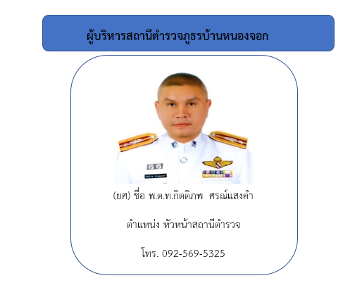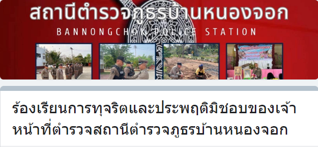 ช่องทางร้องเรียนโดยตรงต่อหัวหน้าสถานีตำรวจภูธรบ้านหนองจอก พันตำรวจโท กิตติภพ ศรณ์แสงคำ สารวัตรสถานีตำรวจ/หัวหน้าสถานี โทร 092-569-5325